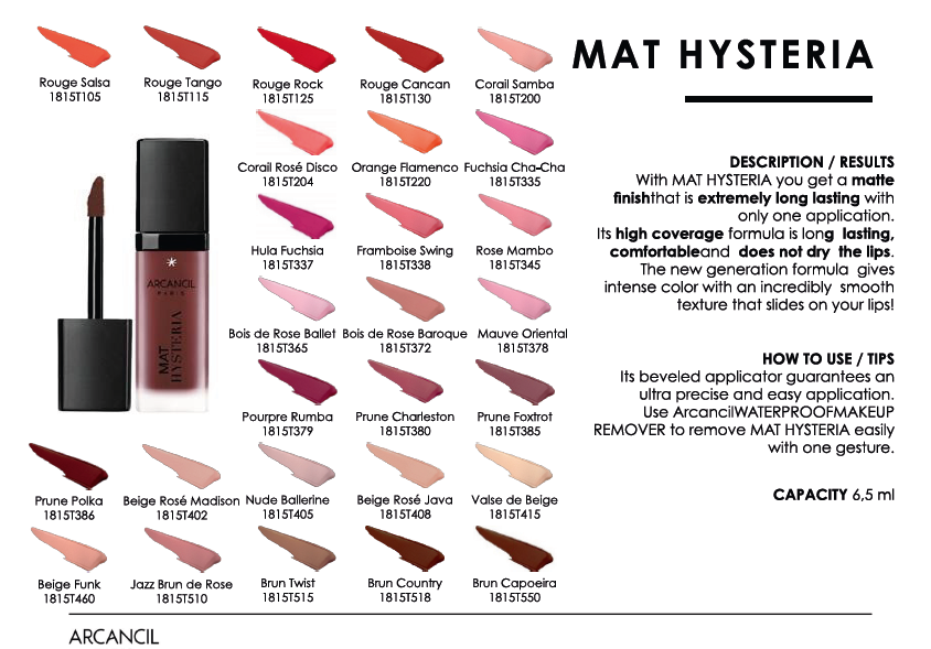 رژ لب مات هیستریا Arcancil، محصول فرانسه با خاصیت مرطوبکنندگی لب ها و پوشش یکنواخت و ماندگاری طولانی مدت تا ۱۲ ساعت